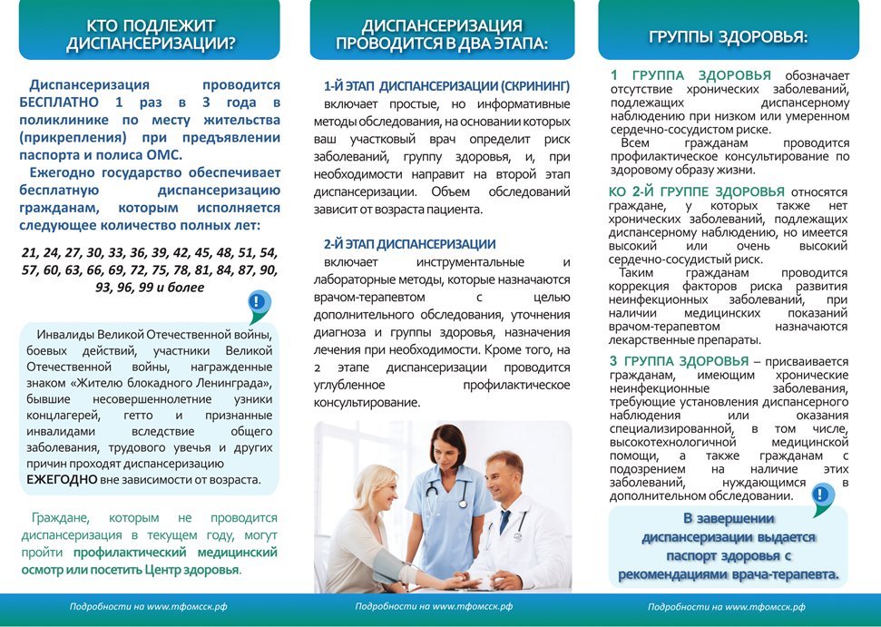 - периодически в течении года (согласно приказу, порядку и методическим рекомендациям) участковый врач-терапевт или другой специалист (в зависимости от заболевания) информирует о порядке, объеме и периодичности диспансерного наблюдения;